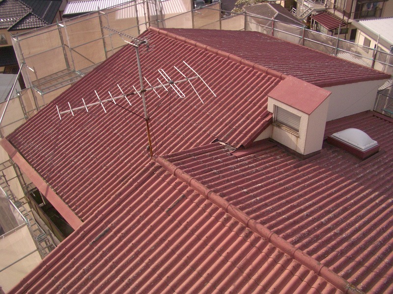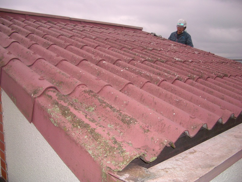 既設屋根(スレート瓦葺き)・・・色落ちして、割れている所もありました。 既設屋根を撤去し、下地(構造用合板)・下葺き材はゴムアスルーフィングを敷き込み、 今回はアメフィトルーフィング(ローマンルーフィング・タスカニー)を葺きました。