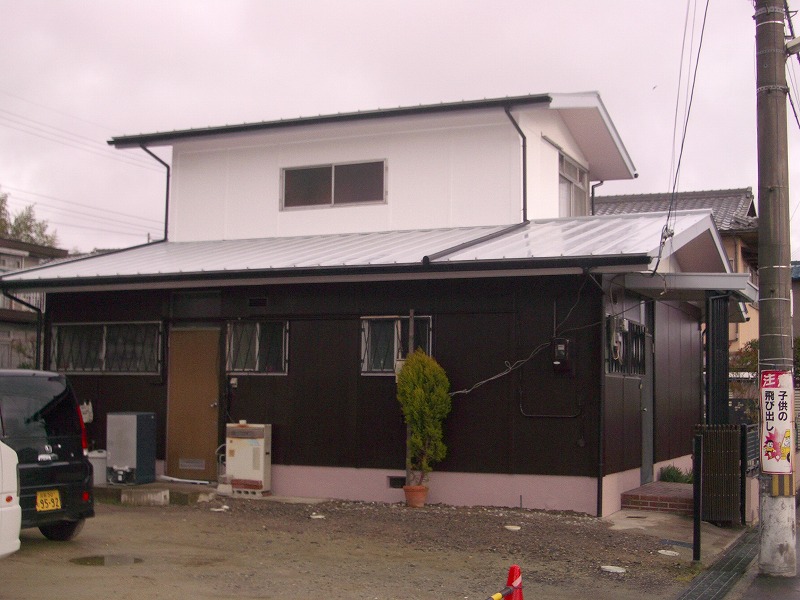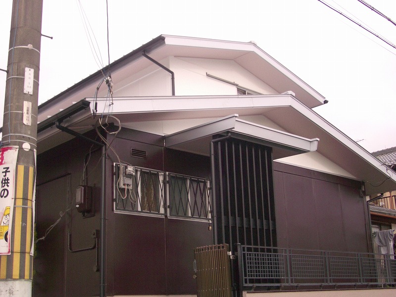 屋根が変われば(リフォーム工事) こんなにすっきりした外観になりました。 屋根は、((ガルバリウム鋼板素地))・勘合式竪平葺きにて施工しました。 軒先の鼻隠しも (ガルバリウム鋼板素地)・・・ ケラバの破風納めも (ガルバリウム鋼板素地)・・・加工し納めました。 ・・・・こんなにすっきりとした外観に仕上がりました。
