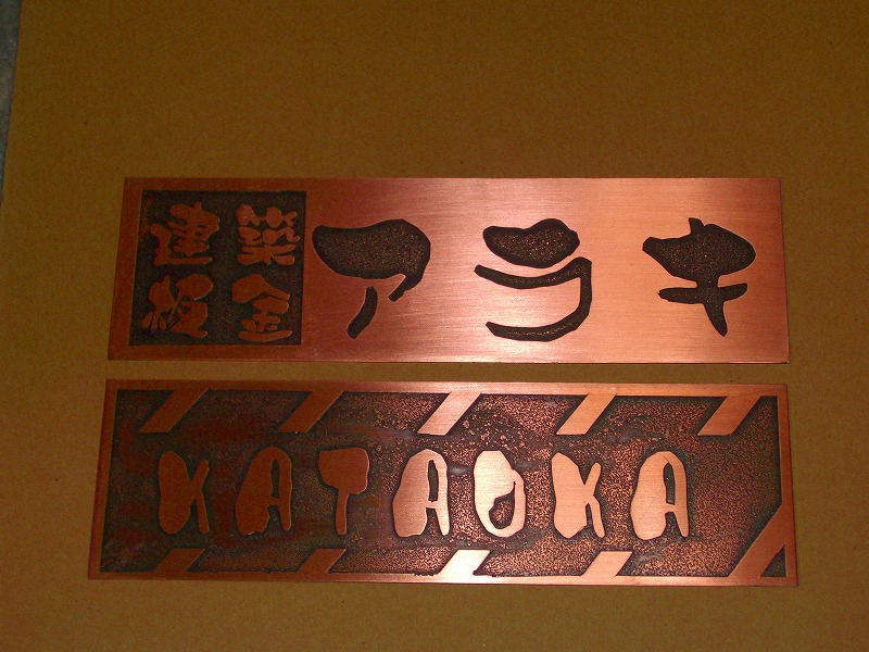 銅板を使って表札を(エッチング加工)にて作ります。 エッチングは溶剤を使用し、銅板に凹凸を付けます。 文字に色を着ける・・・きれいに水洗いをし、乾かして(サンドペーパー)などを使って 銅板にヘアーラインをつけていきます。色落ちなどを防ぐため・・・仕上げにクリア ーのスプレーを吹きつけます。 色付けは、ムトハップを使用して仕上げました。 お問い合わせは・re.araki@deluxe.ocn.ne.jpまで、