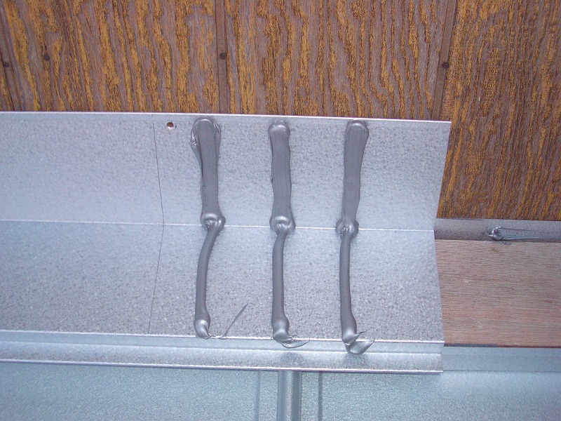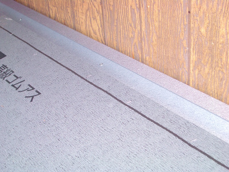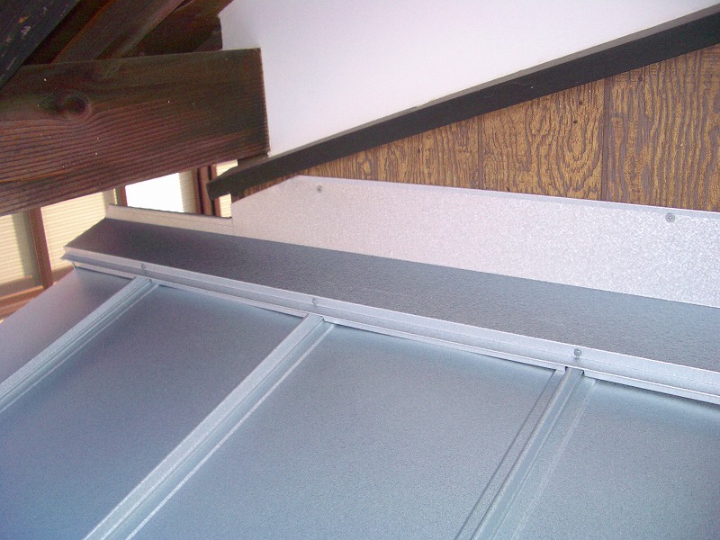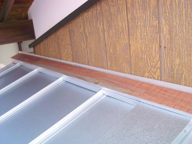 屋根・・・施工手順の一例です。 下地材・・ゴムアスファルトルーフィング 軒先・雨押え・一次下地など 水上下地・・雨押え下地を取付る・・木下地を施工・・雨押え施工(継ぎ目には、シー リング材を充填三筋)固定はカラービスを使用 お問い合わせは・re.araki@deluxe.ocn.ne.jpまで、