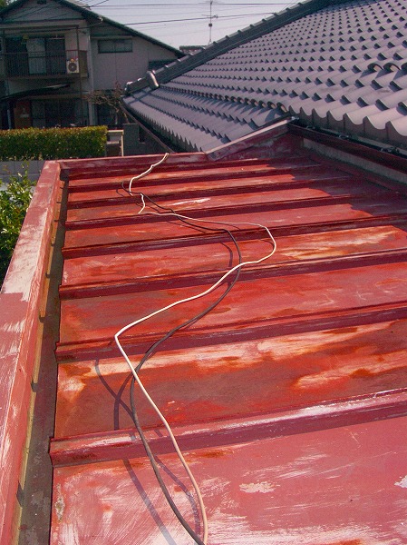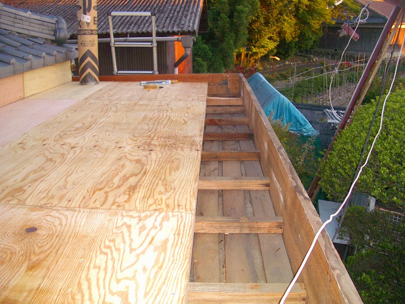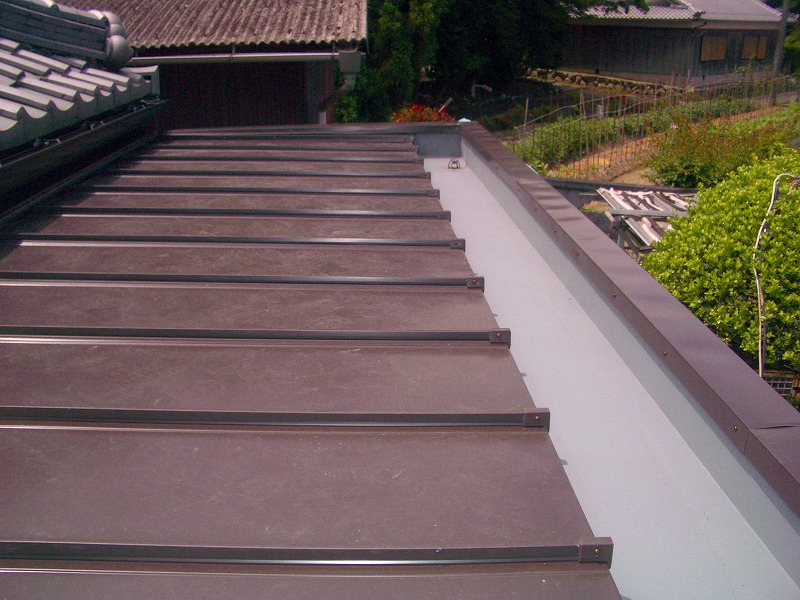 玄関ポーチ屋根改修工事 雨漏れが原因で下地が腐っていました。 下地(垂木・野地板)の改修を行い、内谷の幅を100ミリから300ミリに大きくし、 耐酸被服鋼板にて施工しました。 屋根本体は遮熱カラーステンレス(t0.35)の勘合式竪平葺きを施工し、 これで錆にも強く、屋根の熱も遮熱してくれます。 あなたの玄関など・屋根は元気ですか。雨漏れはしてませんか。 お問い合わせは・re.araki@deluxe.ocn.ne.jpまで、