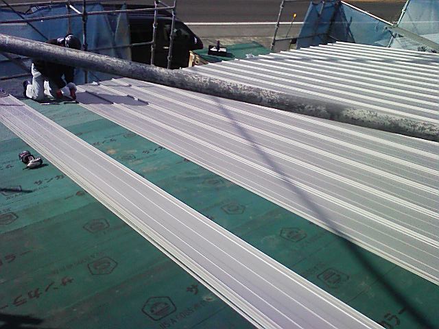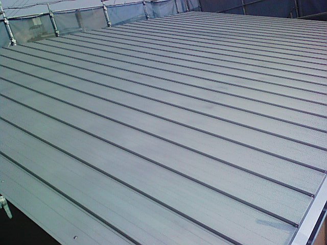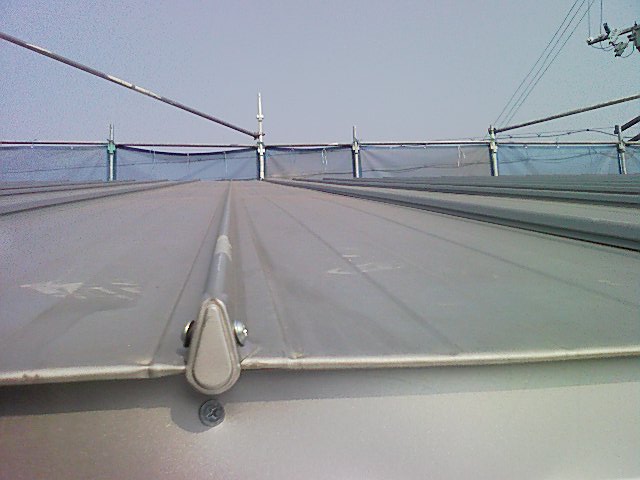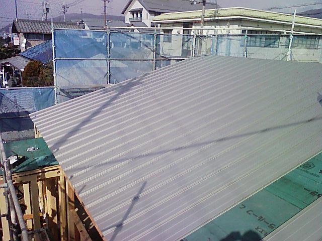 屋根立平葺です。雪の多い地域で軒の出の少ない建物に樋をかける際、雪で樋が外れたり割れたりするのを防ぐ為に、水切りを入れました。