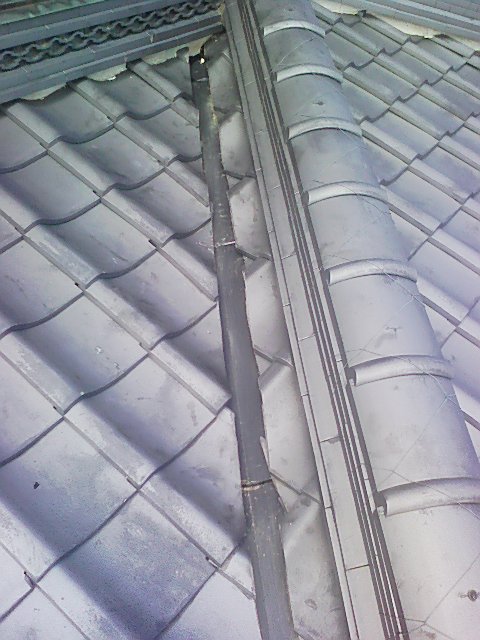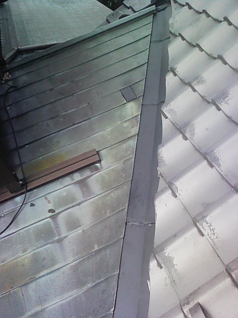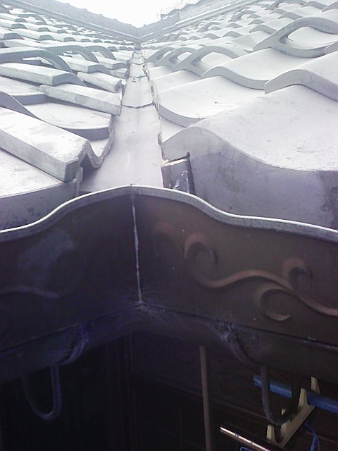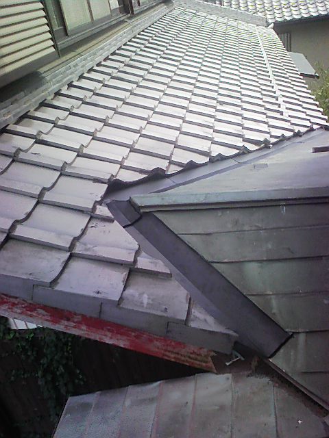 銅板にて谷水切りが施工されていましたが年月が経ち、瓦からの雨水が特によく当るところが穴が開いている所や開きそうな箇所があったので、ステンレス板でカバーしました