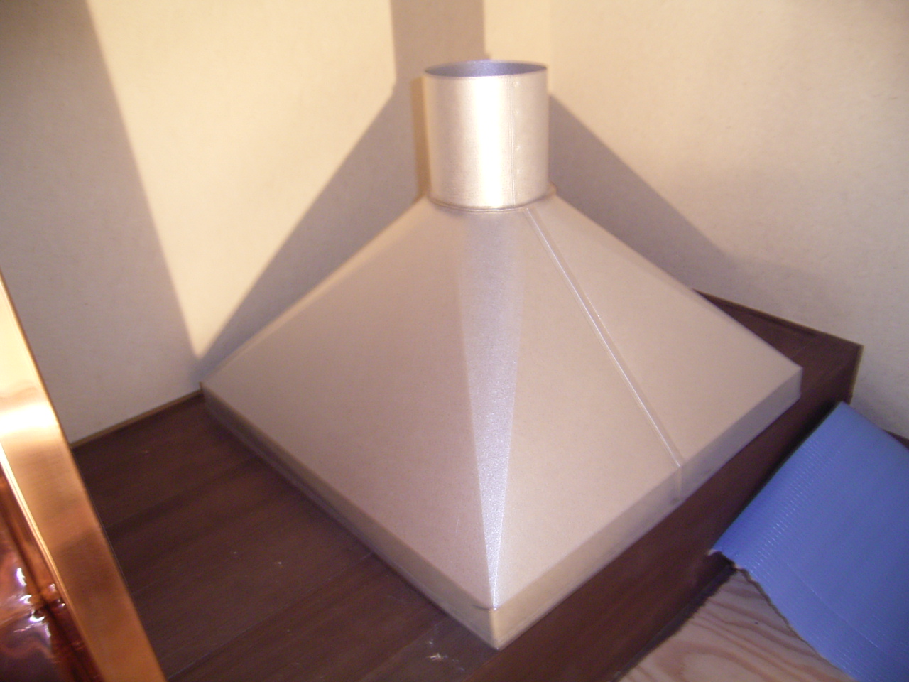 囲炉裏と排煙ホッパーを加工し取り付けました。 最近ではこういった手加工の製品は少なくなりましたが、ハンドメイドだからこその納まりと質感は、既製品では表現できない世界でひとつの作品となります。 今回、囲炉裏は銅板の0.4mm、排煙フードはガルバリウム鋼板・素地の0.4mmで加工しました。 420mm角の排煙ホッパーより吸い込まれる煙は、100mmの筒状のスパイラルダクトを通り、外へ排出されます。